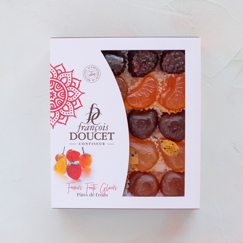 These confectioneries are presented in the shape of frozen fruits. Assortment: apricot, tangerine, pear, strawberry, raspberry.
